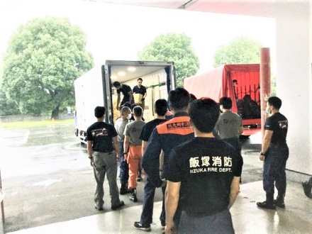 ①トラックが到着後、福岡県内の各消防署から派遣された消防隊員が荷下ろしを手伝っていただきました。