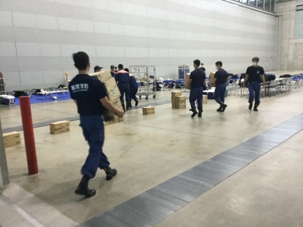 ③食糧品は、水、レトルトごはん、レトルトカレーや缶詰、スープ類を朝昼夜ごとにメニューを考えて提供しています。ちなみに、消防隊員はレトルトごはんやレトルトカレーは一人2個づつです。水は、一人1日2ℓペットボトル2本です。2泊3日だと6食分なので2トントラックに積む物量になります。