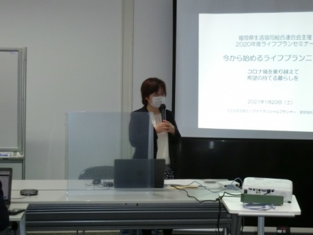 2021年1月23日(土)「ライフプランセミナー」を開催しました。今回は新型コロナウイルス感染症拡大により緊急事態宣言期間中ではありましたが、オンライン(Zoom)と会場参加を併用して行いました。会場参加者(午前の部18人、午後の部25人)、オンライン視聴者(午前の部21人、午後の部22人)の多くの参加者となりました。感想文にも、オンライン視聴は参加しやすく、コロナ禍で助かるとのご意見をいただきました。ただ、午前の部は1時間ほどZoomにつながらないという状況になり、大変ご迷惑をお掛けしました。お詫び申し上げます。