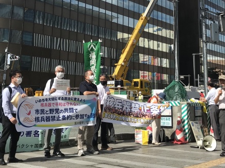 「日本政府に対する核兵器禁止条約の署名と批准を求める」署名推進福岡県連絡会主催の博多駅前昼休み街頭署名活動を16団体30名の参加で行いました。
