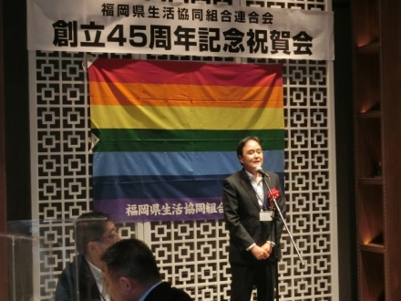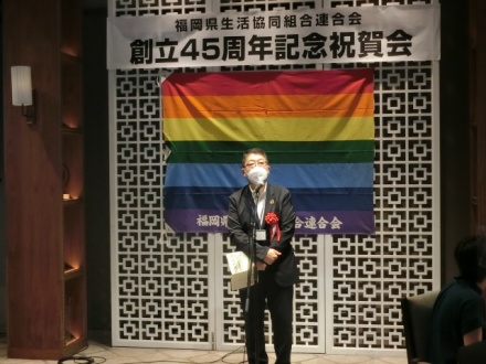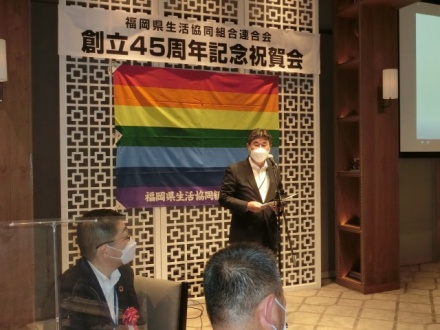 また、当日16時30分より、昨年コロナ過で中止をしていた「福岡県生協連創立45年記念祝賀会」を執り行いました。日本生協連九州地連事務局長 菅原清明様に来賓祝辞を頂き、歴代三役を代表して元会長理事の宮﨑正義様よりご挨拶を頂きました。福岡県生協連創立時からの記録写真スライド上映も行い、過去の取り組みを振り返ることができました。創立50周年に向け、社会的課題に向き合い、会員生協と共に進んでまいります。今後ともご支援、ご協力よろしくお願いします。