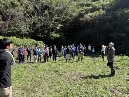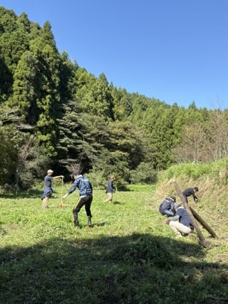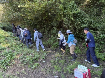 当日(10月11日)は、まさに真夏のような強い日差しの中での活動となり、参加者の体調管理を呼びかけられるなど、厳しい暑さの中での作業となりました。エフコープ生協の田島常務による開会挨拶の後、各自作業に取りかかりました。「コープの森」として管理されている土地でしたが、イノシシによる掘り返し跡や大雨の影響による土壌の流出が見られ、雑草も背丈ほどに伸びていました。こうした状況から、森林を適切に管理していくことの重要性を改めて実感しながら、整備作業に取り組みました。