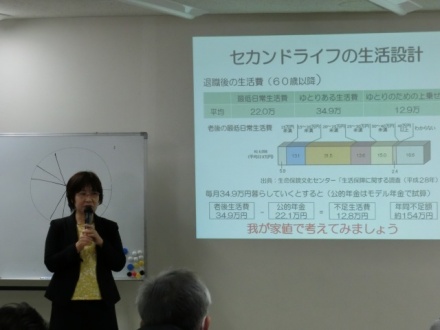 インフルエンザが大流行する寒い中、会場が満席になるほどの参加者がありました。皆さんが、最後まで熱心に講師の話に耳を傾けていたのが印象的でした。ご夫婦の参加が3組ありました。定年後の不安を少しでも減らすために、事前の準備と基礎的な知識を得ることは大事なことです。毎年この時期に日本生協連の助成金を得て開催する「ライフプランセミナー」は、菅野美和子先生のわかりやすい説明もあり好評です。