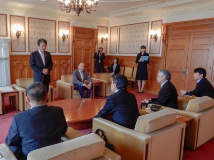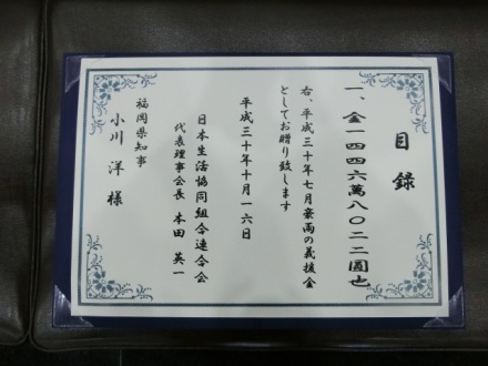 小川知事からは、「お預かりした義援金は、皆様の温かいお気持ちを添えて、被災地にお届けします。県では、公共土木施設の復旧や被災者の生活再建など、被災地の一日も早い復旧・復興に全力を尽くしておりますが、行政だけではどうしても行き届かないところに、義援金を有効に活用させていただきたいと思います」とお礼の言葉を頂きました。福岡県連からは、堤新吾会長理事より、エフコープ生協の支援活動、藤本晶博副会長理事からは、グリーコープ生協ふくおかの支援活動の紹介が資料と共にありました。また、日本生協連九州支所鈴木浩文事務局長からは、全国の生協の募金参加の状況や支援活動についてお話がありました。