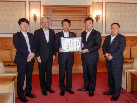 (写真左から)日本生活協同組合連合会 九州地連 事務局長 鈴木浩文氏、福岡県生協連 専務理事 菊谷宗徳氏、小川県知事、福岡県生協連 会長理事 堤新吾氏、 副会長理事 藤本晶博氏