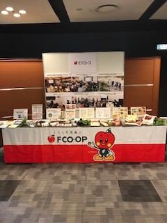 会場ロビーでのエフコープ生協のブース出展     (支援の写真や災害の食事に使えるコープ商品を展示)