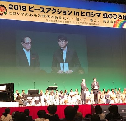 午後からは、広島県立体育館にて「虹のステージ」を見学しました。オープニングでは、広島市立千田小学校合唱隊の歌がありました。さまざまな企画の終盤で松井広島市長と田上長崎市長が登壇され、恒久平和への願いを込めてお二人の挨拶がありました。