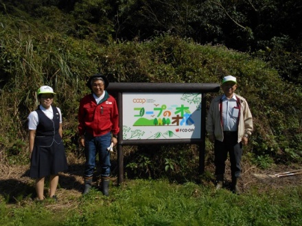 「コープの森」現地看板の前でJA福岡中央会の方と 福岡県生協連 菊谷専務理事
