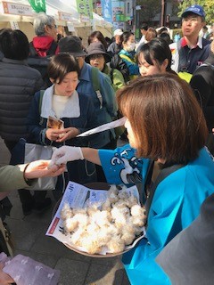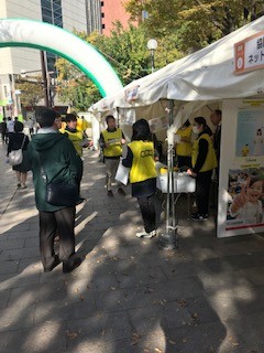 福岡県生協連は、「協同組合ふくおかネットワーク協議会」の一員として参加しました。2つのテント出展で、クイズやアンケート、ガラポン大会、鰆(さわら)めしの素の試食を行いました。秋晴れの天候にも恵まれ、多くの一般の方に立ち寄っていただきました。参加団体は農業・水産・畜産・林業関係団体及び飲食業者等々で88団体でした。