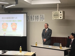 会長理事 松本等 様、専務理事 本銅貴重 様がコープえひめ本部にて出迎えていただきました。コープえひめ運営企画部次長 濱野幸代 様より「平成30年7月豪雨の対応について」報告と交流を行いました。次に、コープえひめ店舗事業部次長 白井貴裕 様よりコープ余戸(ようご)店の概要について説明いただき、そのあと、コープ余戸の店舗見学を行いました。店長の横田敏郎 様に出迎えていただき、おいしいミカン(甘平かんぺい)をいただきました。